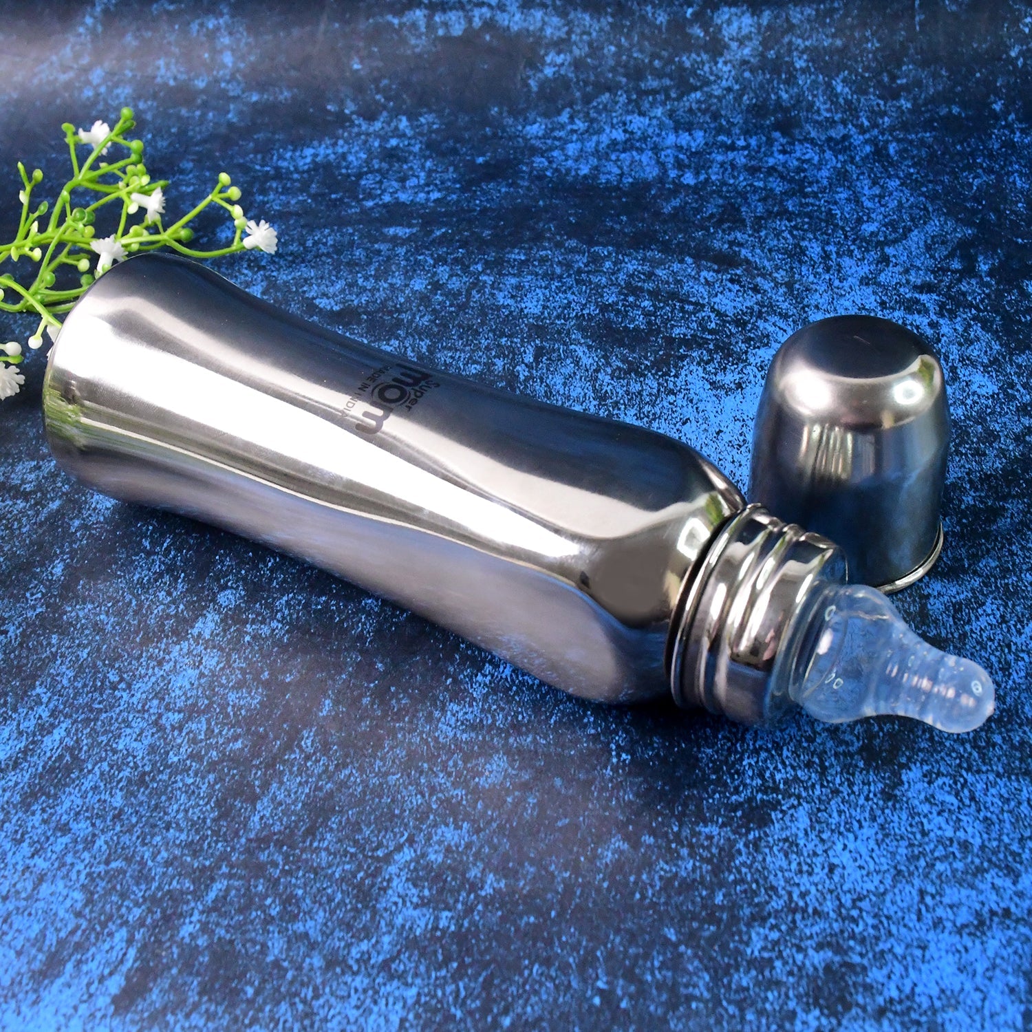 The bottle features a clear measurement scale on the body for accurate milk or liquid preparation and a leak-proof cap that ensures spill-free feeding and easy portability. Its ergonomic design makes it easy to grip and feed, while the stainless-steel build keeps the liquid safe, odor-free, and long-lasting.